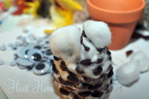 - Glue the innocent and cute wobble/google eyes onto the cotton balls and glue a couple of small feathers to his little head.
