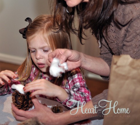 Make sure you have open pine cones; if not, dry the moisture out of them. Here is how to craft the cotton ball and pine cone owl.